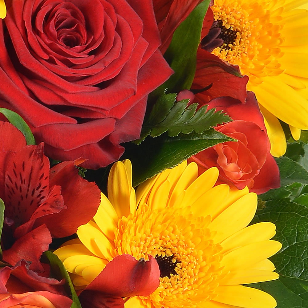 Bouquet rond coloré dans les tons rouge, orange et jaune composé de roses, germinis et autres fleurettes de saison.