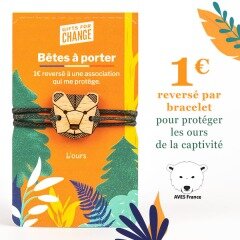 Le bracelet "Ours" est un bracelet écoresponsable fabriqué avec des matériaux durables et biodégradables de chez Gift for Change. Fabriqué en France. Il soutient le mouvement des espèces menacées soit 1€ reversé par bracelet pour protéger les ours de la captivité.