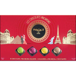 COFFRET 8 CHOCOLATS MACARON : À travers ce nouvel étui, Maxim’s célèbre le mariage gourmand du macaron et du chocolat dans un étui de 8 chocolats fins couronnés d’une authentique coque de macaron - 2 chocolats macarons framboise - 2 chocolats macarons citron- 2 chocolats macarons pistache - 2 chocolats macarons caramel