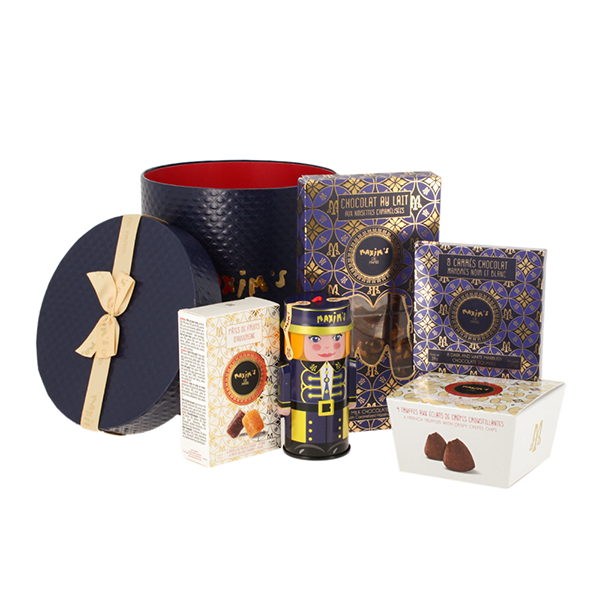 Coffret "Réveillon", composé de 5 produits Maxim's autour de la confiserie et du chocolat. 1 tablette chocolat lait noisettes caramélisées 85g 1 étui de 8 carrés de chocolat marbrés 39g 1 étui de 6 pâtes de fruits 42g 1 ballotin de 4 truffes chocolat aux brisures de crêpes dentelle 34g 1 boîte métal réutilisable mini-groom “Joséphine” avec 4 flûtes feuilletées chocolat noisettes 26g Poids : 226g