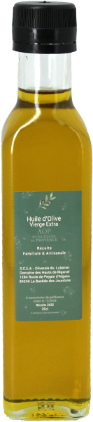 Bouteille d'huile d'olive vierge extra AOP 25 cl - Huile d'olive de Provence - Récolte Familiale et Artisanale. Domaine des hauts de Riganel - Récolte 2022