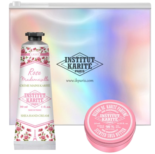 Trousse de beauté de la marque Institut Karité composée d'une crème pour les mains de 30ml à la rose et d'un pot de beurre de karité de 10ml aux notes fleuries.