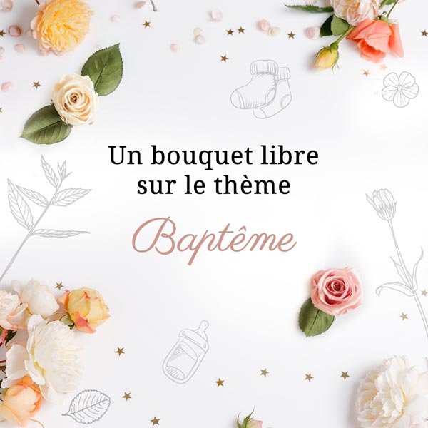 Votre artisan fleuriste réalisera une création sur le thème Baptême en fonction de la touche artistique qui lui est propre, de la tendance du moment, et des fleurs à sa disposition selon la saison. Le visuel présenté est non contractuel.