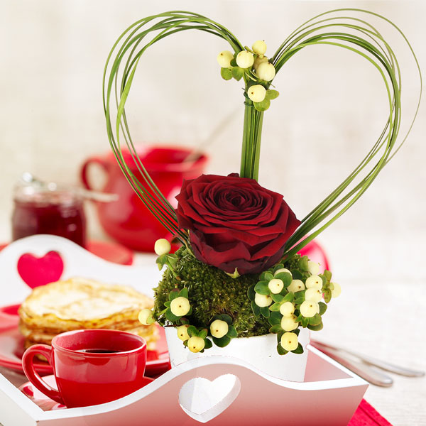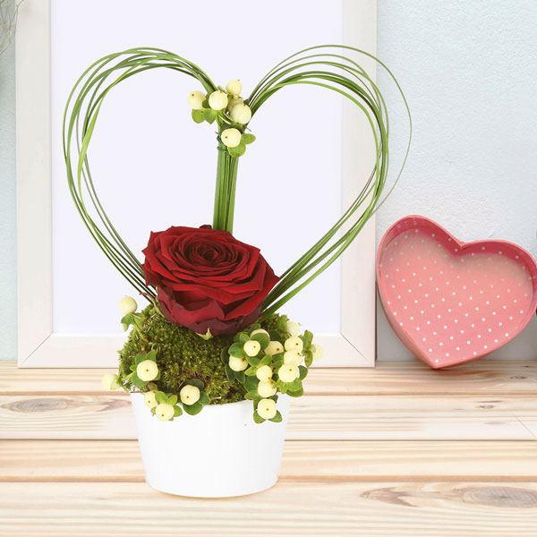 Véritable bijou floral, cette jolie composition de rose écarlate est mise en valeur par le cœur végétal qui l'accompagne. De petites fleurettes au blanc délicat ajoutent un semis de diamants à cette composition véritable écrin de vos sentiments les plus forts. A offrir précieusement et amoureusement !