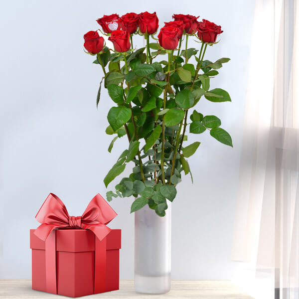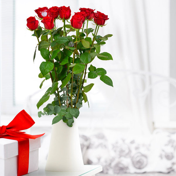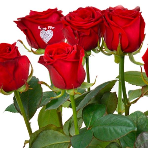 12 roses rouges gros boutons (50cm), dont 1 rose marquée "Bonne Fête" (vase non compris).