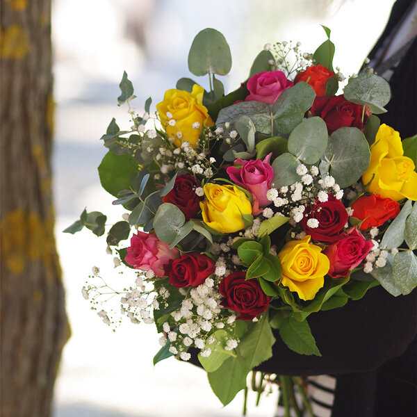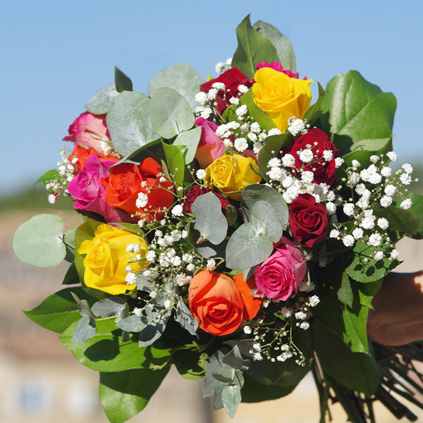 Bouquet composé de 15 roses multicolores accompagnées de gypsophile et d'eucalyptus en guise de feuillage.