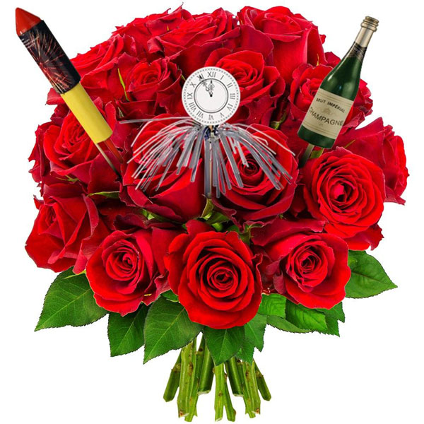 Bouquet de 20 roses rouges agrémenté de 3 pics spécial Nouvel An (1 pic feu d'artifice, 1 pic horloge et 1 pic bouteille de champagne - éléments de décoration) accompagné de son vase en composite transparent.