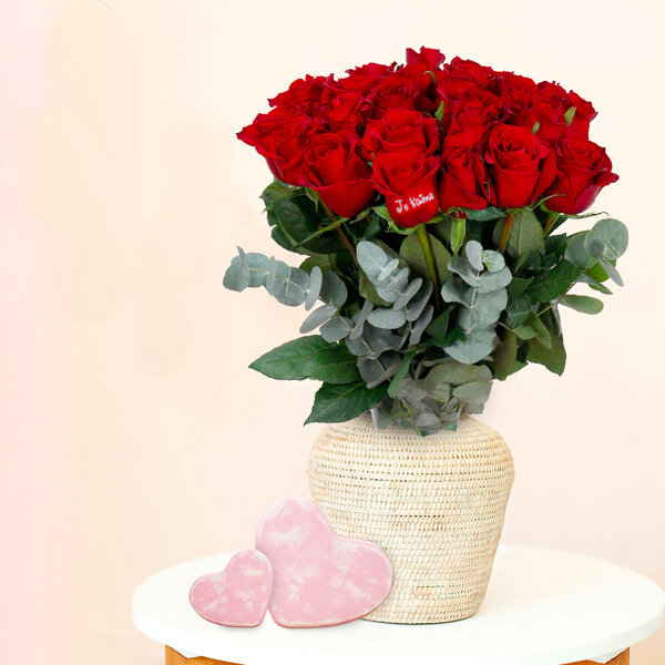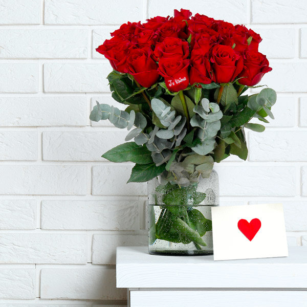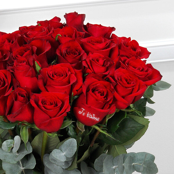 Bouquet de 24 roses rouges gros boutons (60cm) dont 1 rose marquée "JeT'aime" (vase non compris).
