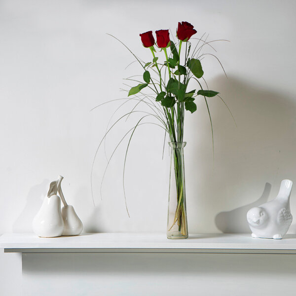 Ce joli vase de verre étincelant ne contient pas une mais trois roses écarlates symboles d’amour passion. Une rose pour « beaucoup », une pour « passionnément» et une autre pour « à la folie». Trois fleurs une seule passion éternelle et illimitée.