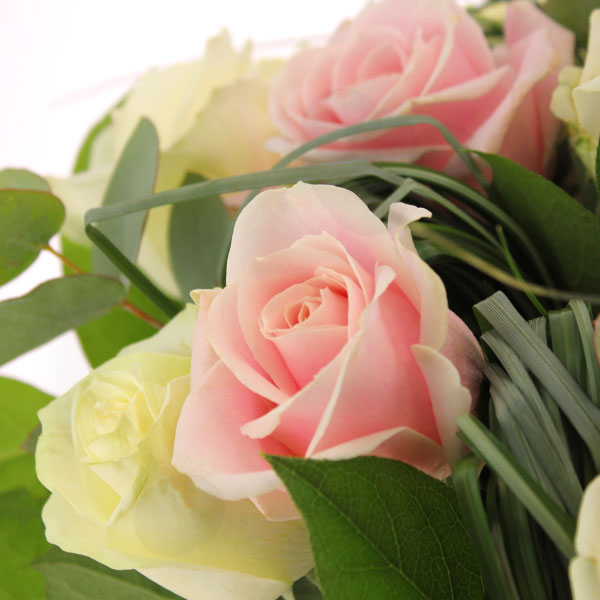 Bouquet rond composé de roses rose, roses blanche accompagné de feuillage.