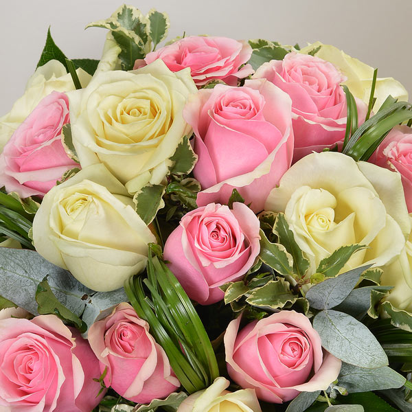 Bouquet rond dans les tons rose clair, blanc et vert composé de roses et divers feuillages en mélange.