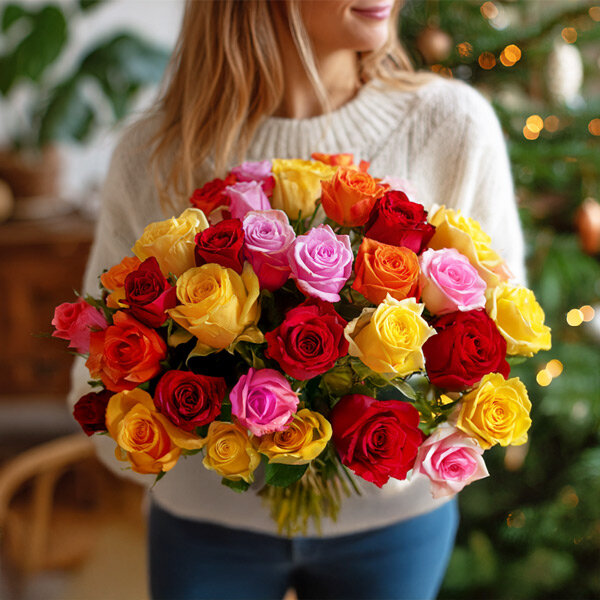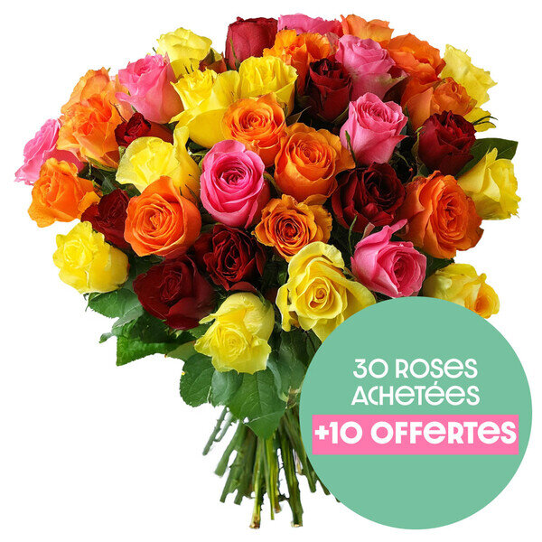 Bouquet de 30 roses multicolores + 10 roses multicolores offertes.