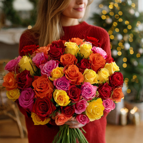 Bouquet de 40 roses multicolores + 10 roses multicolores offertes.