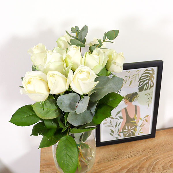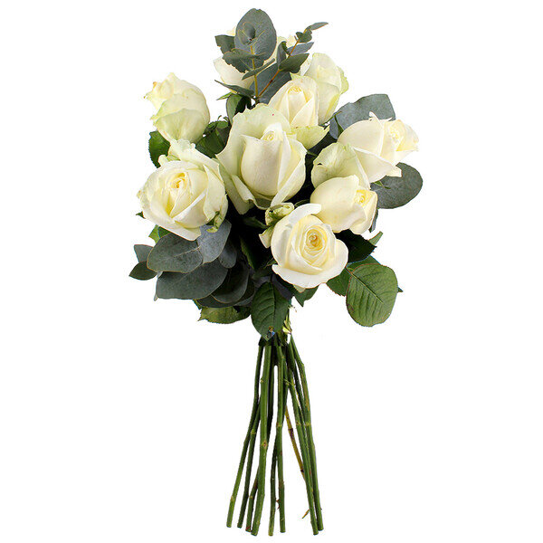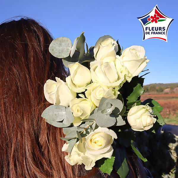 Bouquet composé de 10 roses blanches françaises et d'eucalyptus.