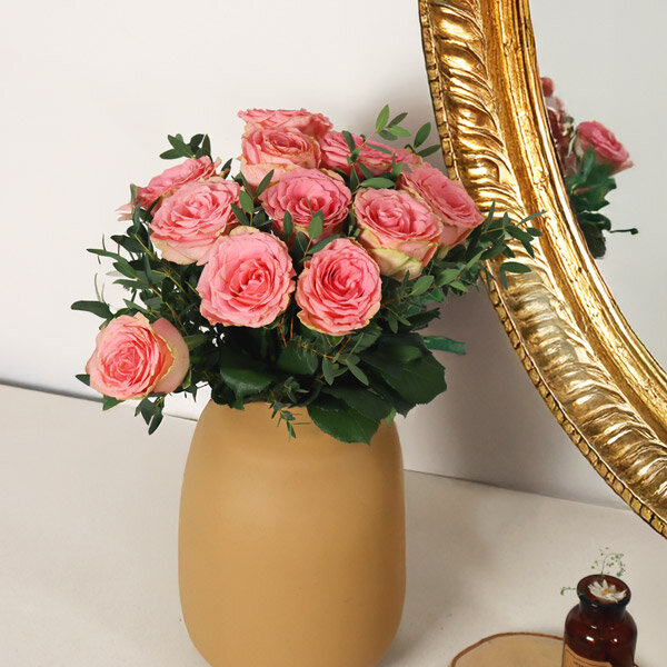 Ce bouquet réunit dix roses roses cultivées en France, accompagnées d'un délicat eucalyptus français qui apporte une touche de fraîcheur végétale. Depuis toujours, le rose incarne la tendresse et la douceur des sentiments... cette couleur exprime parfaitement l'affection sincère que nous portons aux personnes qui comptent pour nous.