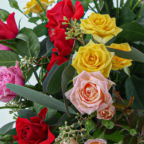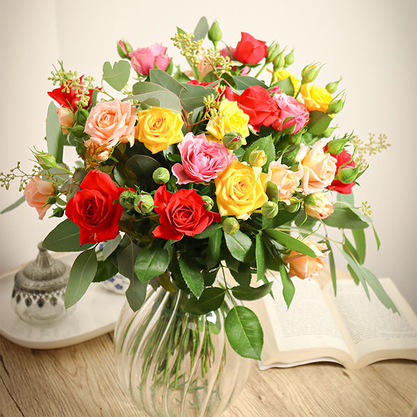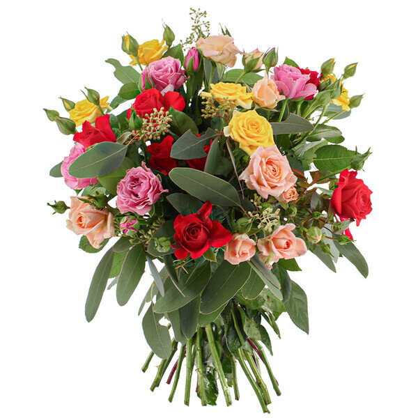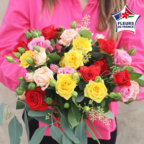 Ce bouquet, c'est une explosion de couleurs qui fait du bien aux yeux ! Les roses spray qui le composent ont cette particularité adorable : chaque tige porte plusieurs petites fleurs, ce qui donne tout de suite un effet généreux et plein de vie. On en compte quinze au total, dans des tons tous différents, le tout rehaussé par quelques branches d'eucalyptus français qui apportent cette touche de fraîcheur.