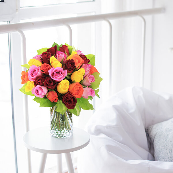La rose se décline avec excellence dans cette magnifique brassée aux teintes colorées. Plein de délicatesse, cette jolie création florale ne pourra que ravir son destinataire lors de sa livraison de roses multicolores.