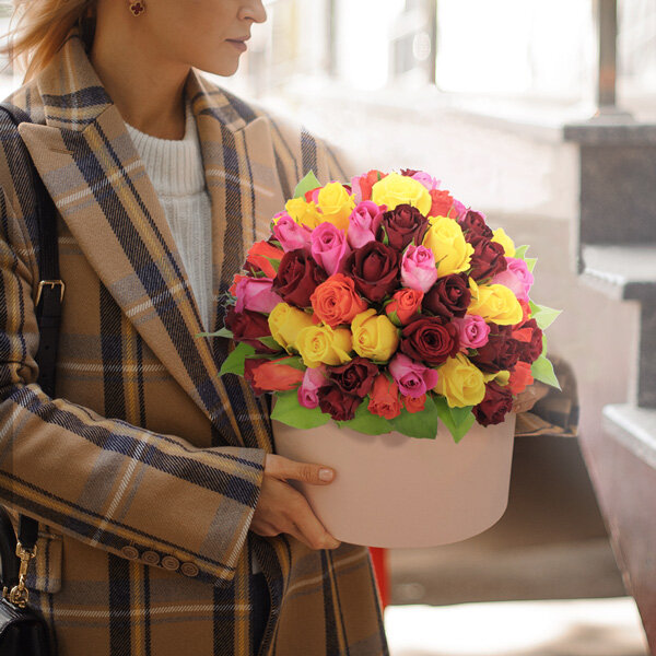 Bouquet de 70 roses multicolores.