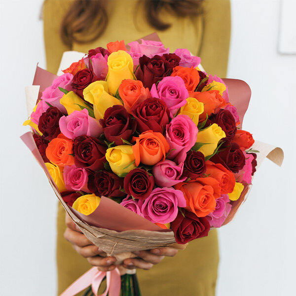 Vous souhaitez célébrer un évènement de manière un peu exceptionnelle ? Cette belle brassée aux teintes vives est le cadeau idéal. Frais et élégant, ce gros bouquet de roses dynamisera les journées les plus moroses et indiquera combien la personne à qui vous l'offrez est importante à vos yeux. L'amour, c'est aussi simple que d'envoyer des roses multicolores !