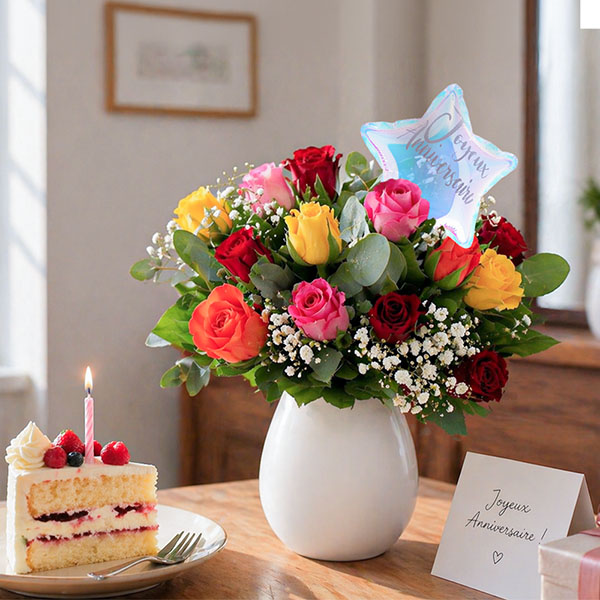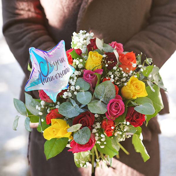 Bouquet composé de 15 roses multicolores accompagnées de gypsophile et d'eucalyptus en guise de feuillage. Le tout surplombé d'un ballon en forme d'étoile portant l'inscription "Joyeux Anniversaire"