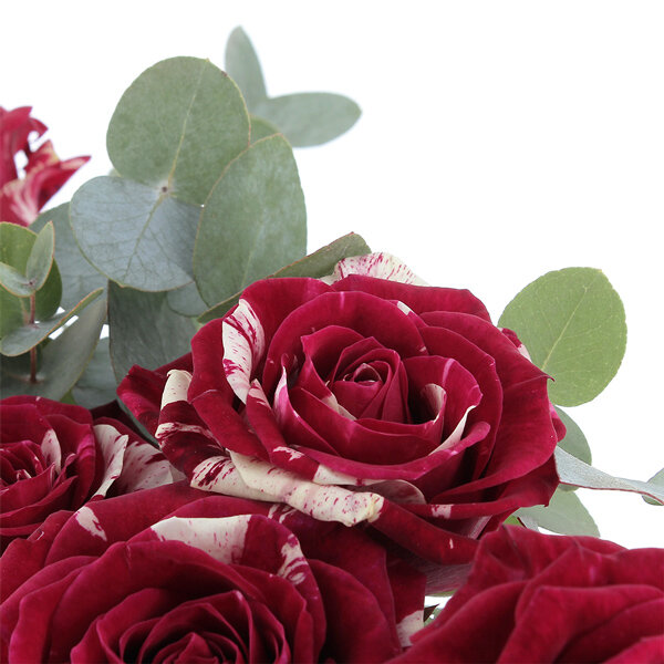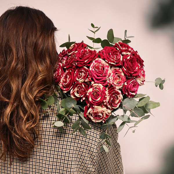Un somptueux bouquet de 19 roses arlequin, accompagné d'eucalyptus, s'agence avec élégance pour former un cœur captivant. Imprégné d'un rouge framboise et d'un blanc crème, ce mariage de couleurs évoque la passion ardente et la pureté délicate. Chaque pétale, vibrant de nuances riches, raconte une histoire d'amour nuancée et raffinée. Offrir ce bouquet, c'est offrir bien plus qu'une simple composition florale; c'est partager un symbole visuel de l'amour, où la passion et l'innocence se rencontrent dans une étreinte florale empreinte d'élégance.