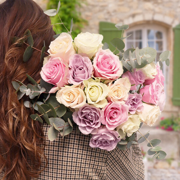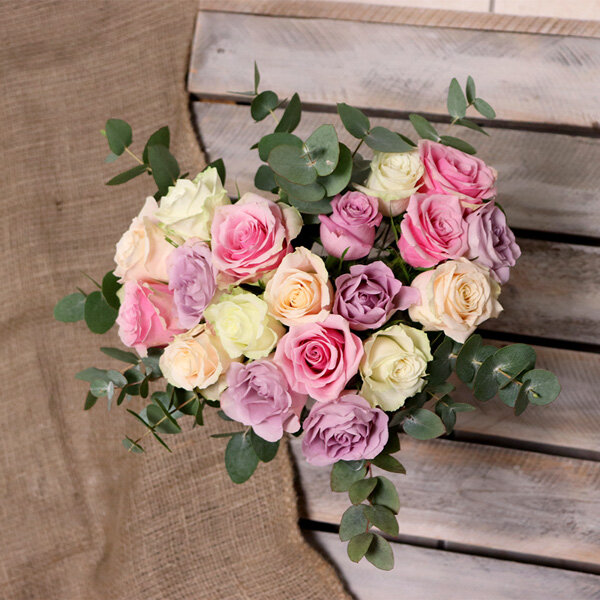 Bouquet de 19 roses pastel avec eucalyptus, disposées en forme de coeur.