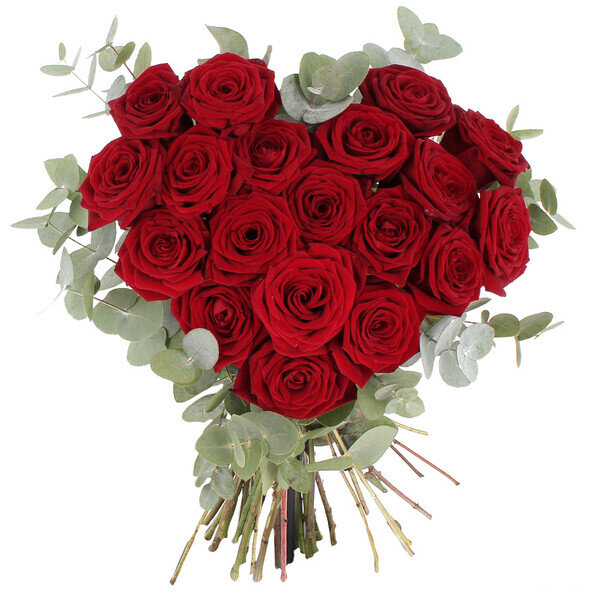 Bouquet de 19 roses rouges Red Naomi avec eucalyptus, disposées en forme de coeur.