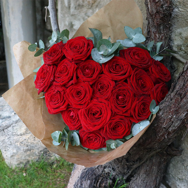 Chaque pétale de ces magnifiques roses rouges Red Naomi respire la passion et la romance. Les roses, d'une couleur rouge profonde, symbolisent un amour ardent et sincère. L'eucalyptus qui les entoure apporte une touche de fraîcheur et d'élégance, mettant en valeur la beauté des fleurs de l'amour. Avec sa forme de coeur, ce bouquet témoignera de la plus belle des manières, tous vos sentiments les plus sincères.