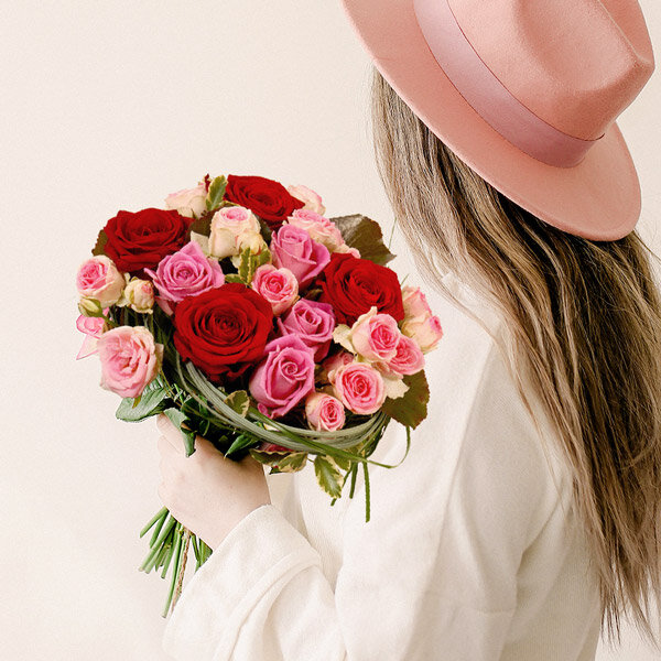 Bouquet rond dans les tons rouge et rose composés de roses et feuillages.