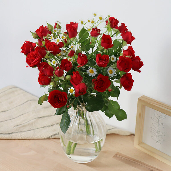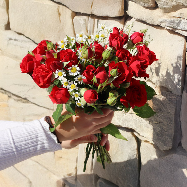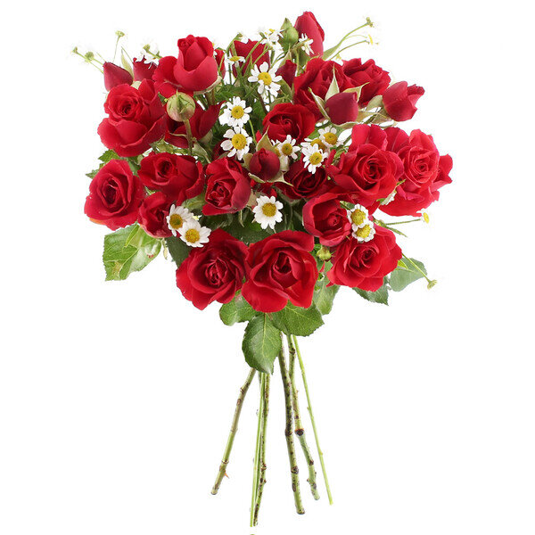 Bouquet dans les tons rouges et blancs composé de 5 roses spray rouges et 3 tanacetum.