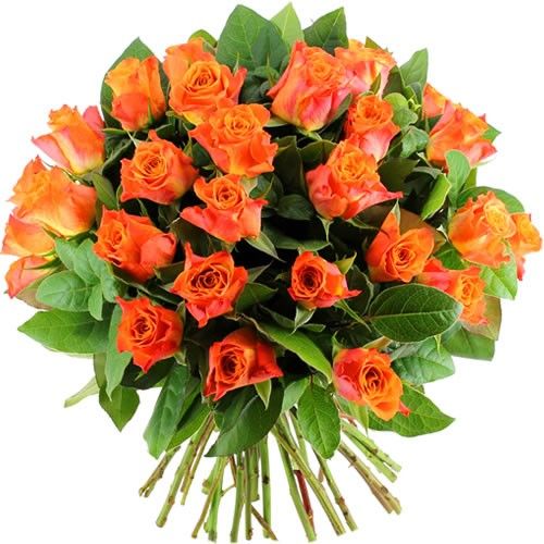 Bouquet de roses courtes orange agrémentées de sallal (la variété et la période peuvent faire varier le prix des roses. Ainsi, pour un tarif affiché, un bouquet de roses peut être composé d'un nombre différent de tiges).