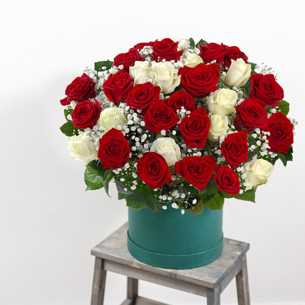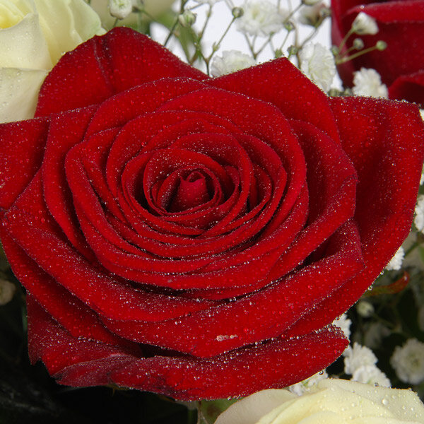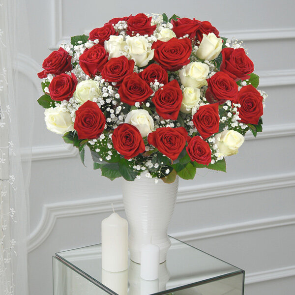 Dans ce bouquet, nous voyons : délicatesse, tendresse, amour, et sincérité. Tant de sentiments passionnés émanant de l’alliance des roses rouges et blanches sublimées par la délicatesse du gypsophile.