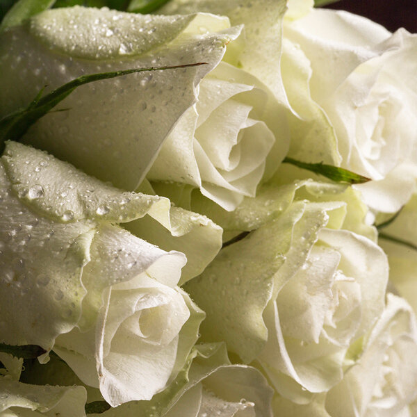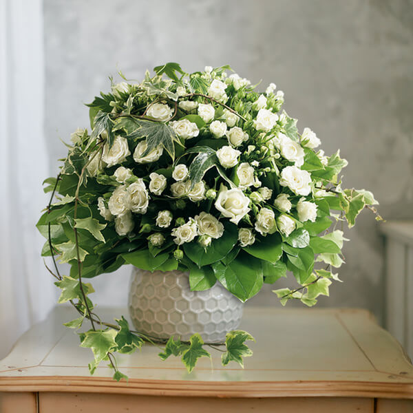 Bouquet rond dans les tons blanc et vert composé de roses blanches branchues (à remplacer par des roses blanches selon saison) agrémentées de lianes de lierre et de sallal (la variété et la période peuvent faire varier le prix des roses. Ainsi, pour un tarif affiché, un bouquet de roses peut être composé d'un nombre différent de tiges).