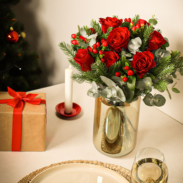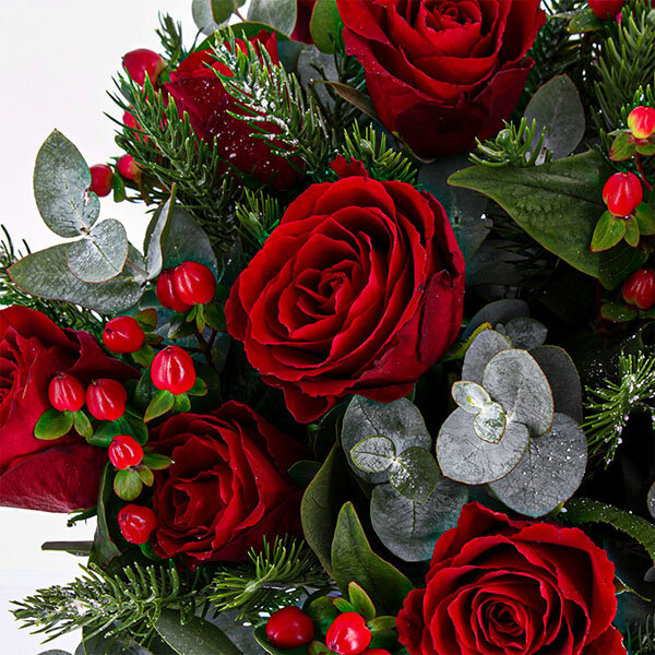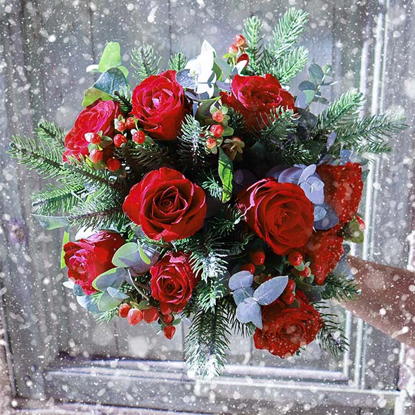Bouquet rouge et vert, composé de roses, branches de sapin et petites baies rouges.