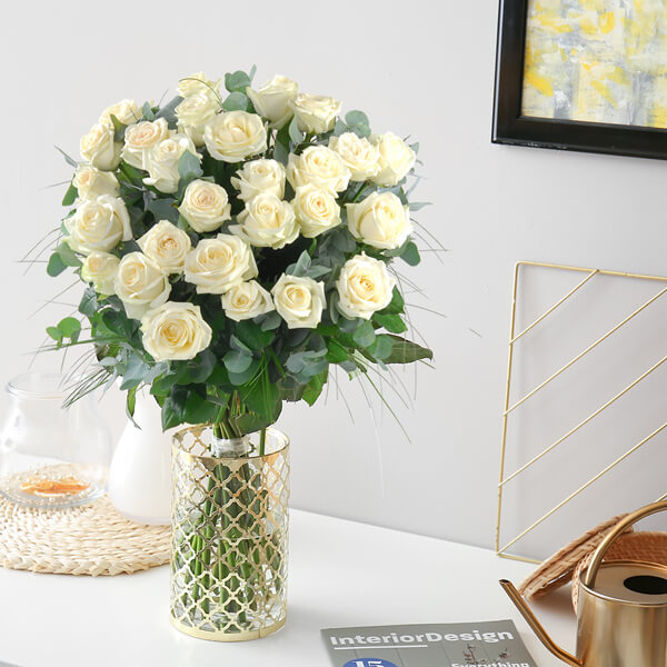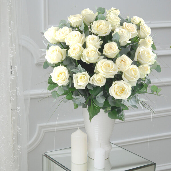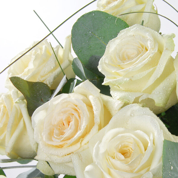 Bouquet rond dans les tons blancs composé de roses et feuillages.