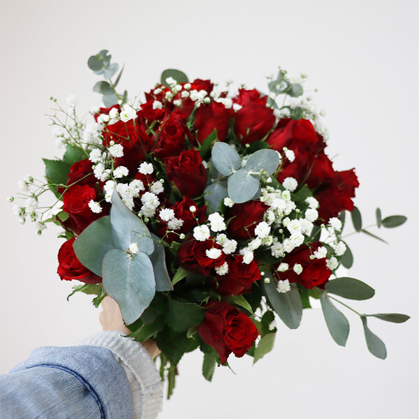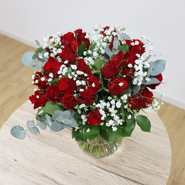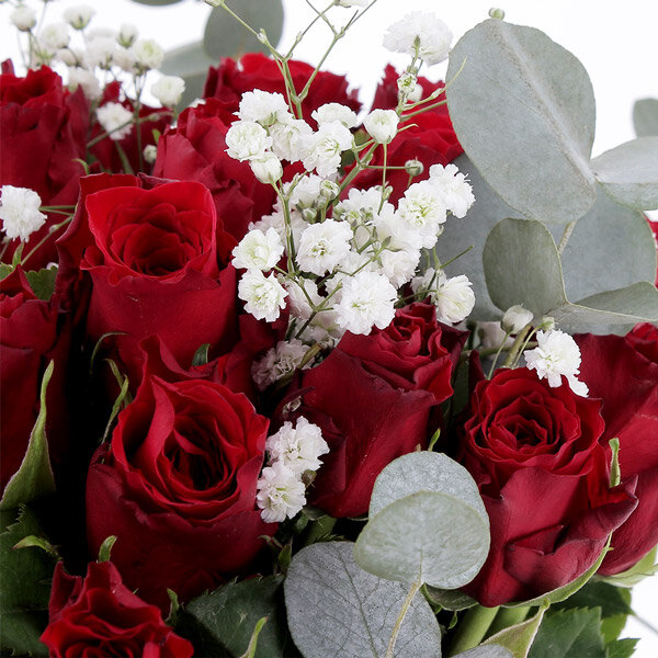 Bouquet composé de 30 roses rouges, gypsophile et eucalyptus.