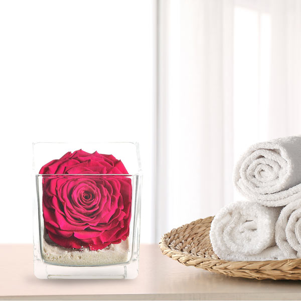 Éternelle et puissante comme l'amour, nos équipes ont apprécié cette jolie composition faite de roses stabilisées harmonieusement disposées dans un contenant de verre scintillant. Une création luxueuse et racée qui ne nécessite aucun entretien. A offrir sans modération.