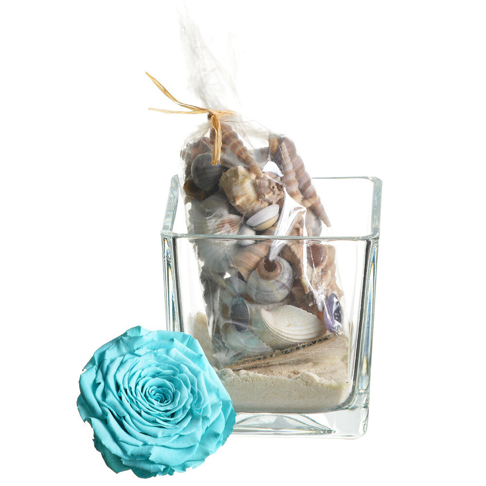 La rose naturelle stabilisée est une rose éternelle, une véritable fleur de couleur bleu clair qui, grâce à un savant procédé, garde sa fraîcheur et sa beauté pendant des années. Elle est accompagnée d'un assortiment de coquillages. Le tout déposé délicatement dans un pot en verre transparent. A offrir sans modération. (Le produit arrive sous forme de kit).