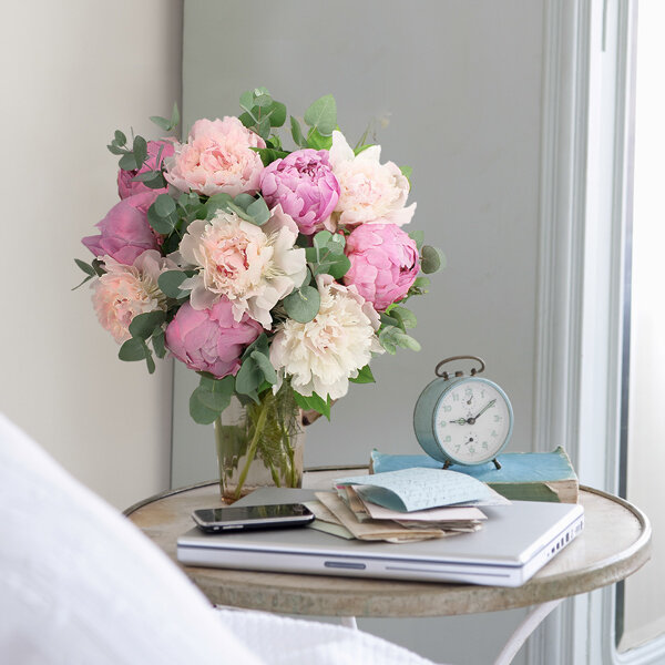Tenue des pivoines : 3 à 6 jours. Pour une meilleure tenue des pivoines, mettre plus de la moitié des tiges dans l'eau.