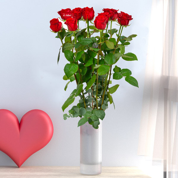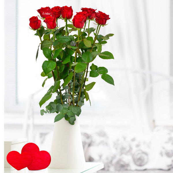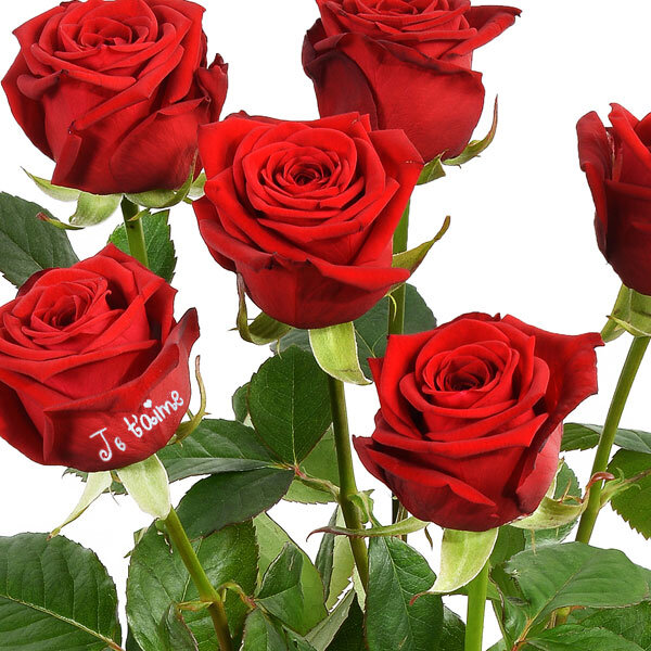 12 roses rouges gros boutons (60cm), dont 1 rose marquée "Je t'aime" (vase non compris).