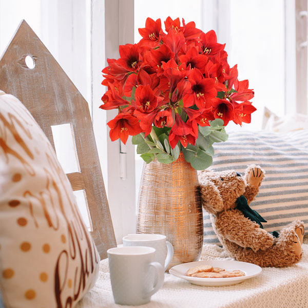 Bonne humeur garantie ! Fleurs de noël par excellence, l’amaryllis nous offre ses couleurs flamboyantes et ses fleurs grandes tailles pendant encore quelques semaines. D’une très bonne tenue en vase, il dynamisera cette période morose. Il est urgent d’en profiter !