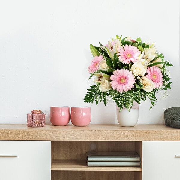Voici l'un des chouchous de la collection Florajet. Nous on l'adore parce qu'avec ses ravissants tons rose clair, il nous rappelle les événements heureux de la vie. Soyez certains de faire plaisir avec cette jolie création.