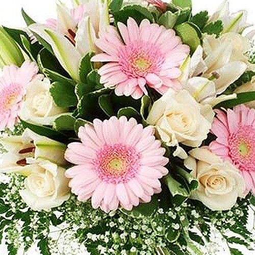 Bouquet rond avec roses, lys et germinis dans les tons rose pâle et blanc.