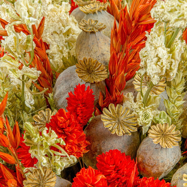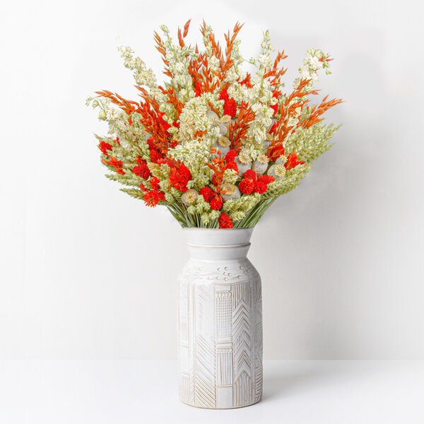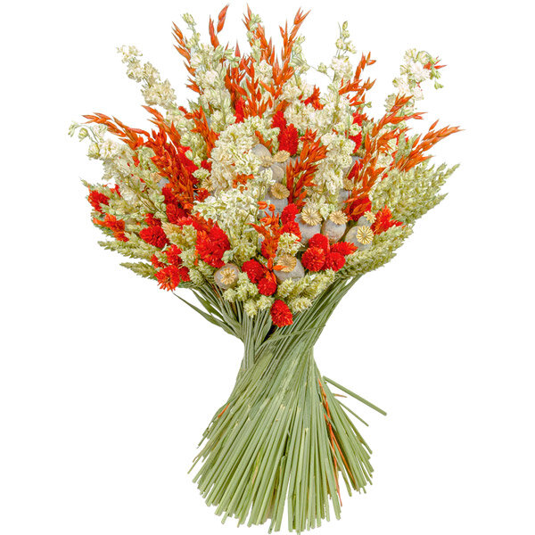 Aussi doux qu'un printemps dans les terres provençales, découvrez notre magnifique bouquet de fleurs séchées, Roussilon. Un hommage à cette terre de feu qui cache en son coeur, la concentration des plus belles fleurs sauvages que la nature puisse nous offrir. Quelques brins de blé, des tiges d'avoine coloré d'un orangé vitaminé et le tour est joué. Disposez votre bouquet dans une cruche ou dans un joli vase texturé et vous voilà transporté dans l'une des plus belles régions de France !
