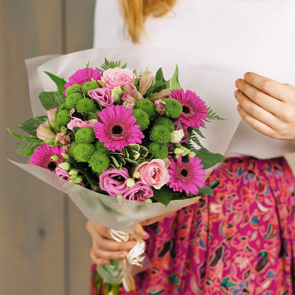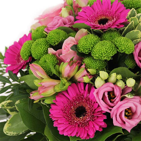 Bouquet dans les tons roses composé de germinis, roses et autres fleurs de saison, le tout accompagné de feuillage.