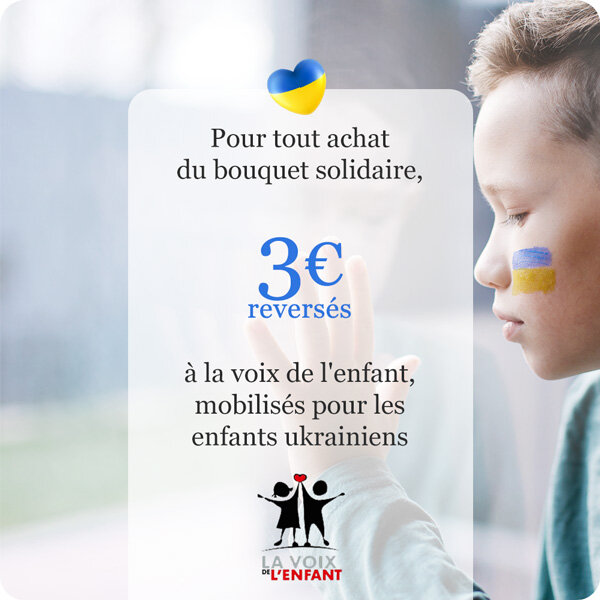 Partenaire de la Fédération La Voix De l’Enfant, Florajet a décidé de soutenir les actions en cours engagées au bénéfice des enfants Ukrainiens directement touchés par le conflit. Florajet conçoit des bouquets spécifiques dont le prix de vente fait l’objet d’un prélèvement de 3 euros reversés à La Voix De l’Enfant et dédiés à son action spécifique pour les enfants Ukrainiens victimes du conflit en cours.