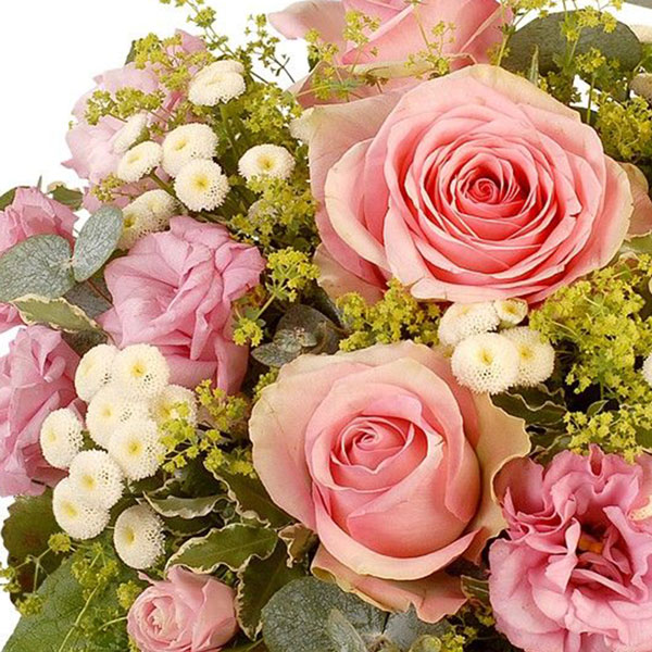 Bouquet rond dans les tons vieux rose et vert avec une touche de blanc composé d'alchemilles, roses et feuillages divers.