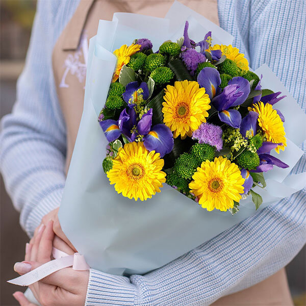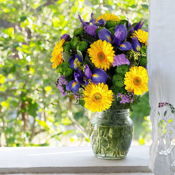 Un magnifique bouquet d'iris aux teintes profondes et l'or des germinis s'unissent dans cette composition, un rendez-vous entre la lune et le soleil. Un vrai clin d’œil du sud de la France avec ses couleurs lumineuses. Un brin de soleil à domicile.
