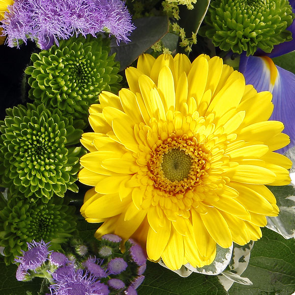 Bouquet rond dans les tons jaune, violet et vert composé de germinis, santinis et autres fleurs de saison.