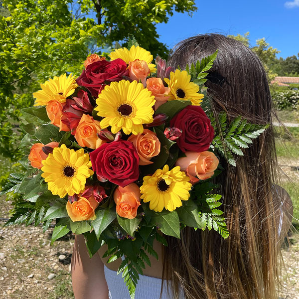 Bouquet rond dans les tons rouge, orange, jaune et vert composé de germinis jaunes, roses oranges et rouges petits boutons, alstroméria rouge, fougère et salal.